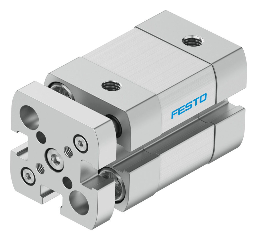 Kompaktzylinder ADNGF-12-5-P-A nach ISO 21287, mit Gleitführung, Kolbenstange verdrehgesichert durch Führungsstange und Jochplatte. Hub=5 mm, Kolben-Durchmesser=12 mm, Basierend auf Norm=ISO 21287, Dämpfung=P: elastische Dämpfungsringe/-platten beidseitig, Einbaulage=beliebig
