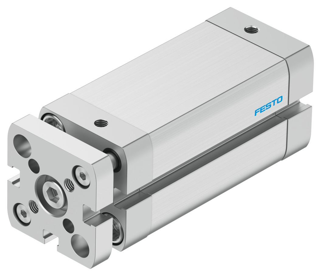 Kompaktzylinder ADNGF-25-50-P-A nach ISO 21287, mit Gleitführung, Kolbenstange verdrehgesichert durch Führungsstange und Jochplatte. Hub=50 mm, Kolben-Durchmesser=25 mm, Basierend auf Norm=ISO 21287, Dämpfung=P: elastische Dämpfungsringe/-platten beidseitig, Einbaulage=beliebig