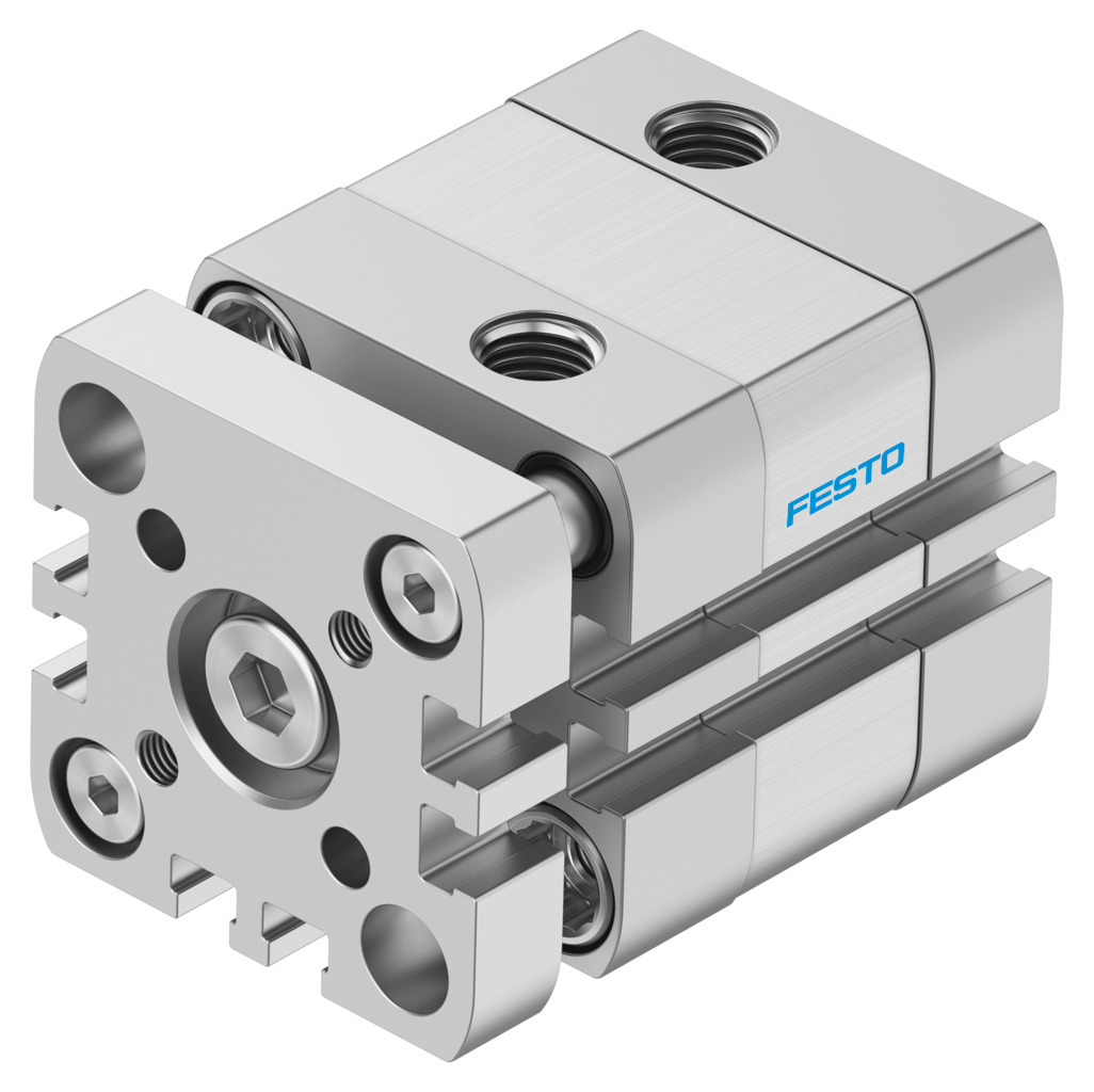 Kompaktzylinder ADNGF-25-60-P-A nach ISO 21287, mit Gleitführung, Kolbenstange verdrehgesichert durch Führungsstange und Jochplatte. Hub=60 mm, Kolben-Durchmesser=25 mm, Basierend auf Norm=ISO 21287, Dämpfung=P: elastische Dämpfungsringe/-platten beidseitig, Einbaulage=beliebig