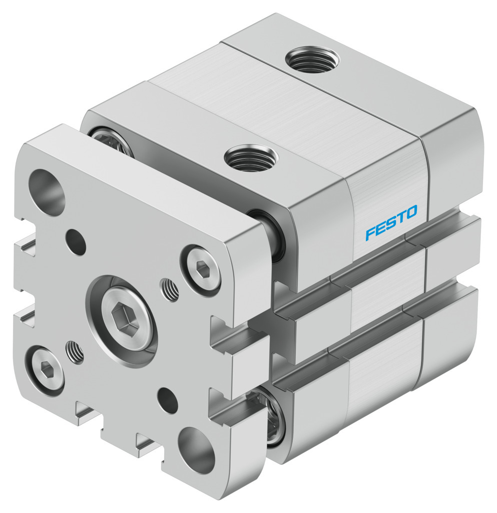 Kompaktzylinder ADNGF-40-5-P-A nach ISO 21287, mit Gleitführung, Kolbenstange verdrehgesichert durch Führungsstange und Jochplatte. Hub=5 mm, Kolben-Durchmesser=40 mm, Basierend auf Norm=ISO 21287, Dämpfung=P: elastische Dämpfungsringe/-platten beidseitig, Einbaulage=beliebig