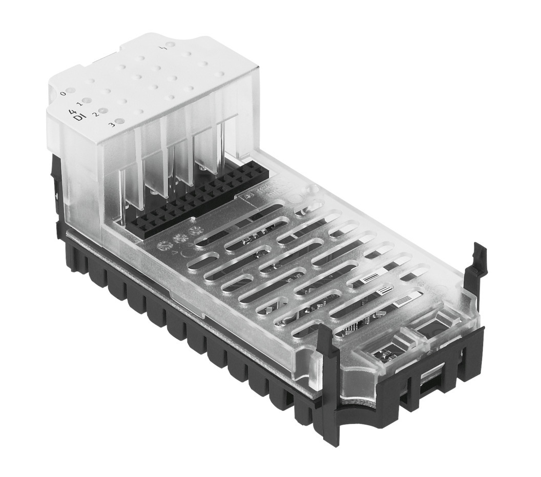 Eingangsmodul CPX-4DE für modulares elektrisches Terminal CPX, 4 digitale Eingänge. Abmessungen B x L x H=(* (inkl. Verkettungsblock und Anschlusstechnik), * 50 mm x 107 mm x 50 mm), Anzahl Eingänge=4, Diagnose=Kurzschluss/Überlast pro Kanal, Parametrierung=(* Eingangsentprellzeit, * Signalverlängerungszeit, * Verhalten nach Kurzschluss, * Überwachung Modul), LED Anzeigen=(* 1 Sammeldiagnose, * 4 Kanalstatus)