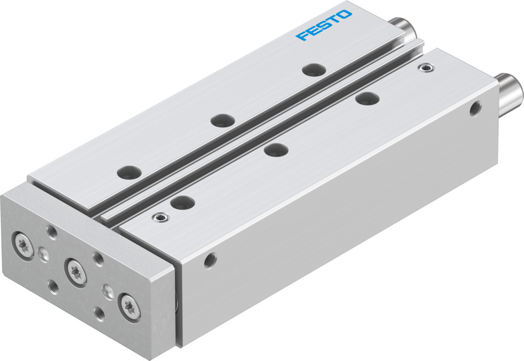 Führungszylinder DFM-16-100-P-A-GF mit integrierter Führung. Schwerpunktsabstand der Nutzlast zur Jochplatte=50 mm, Hub=100 mm, Kolben-Durchmesser=16 mm, Betriebsart Antriebseinheit=Joch, Dämpfung=P: elastische Dämpfungsringe/-platten beidseitig