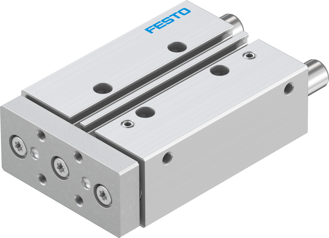 Führungszylinder DFM-16-50-P-A-GF mit integrierter Führung. Schwerpunktsabstand der Nutzlast zur Jochplatte=50 mm, Hub=50 mm, Kolben-Durchmesser=16 mm, Betriebsart Antriebseinheit=Joch, Dämpfung=P: elastische Dämpfungsringe/-platten beidseitig