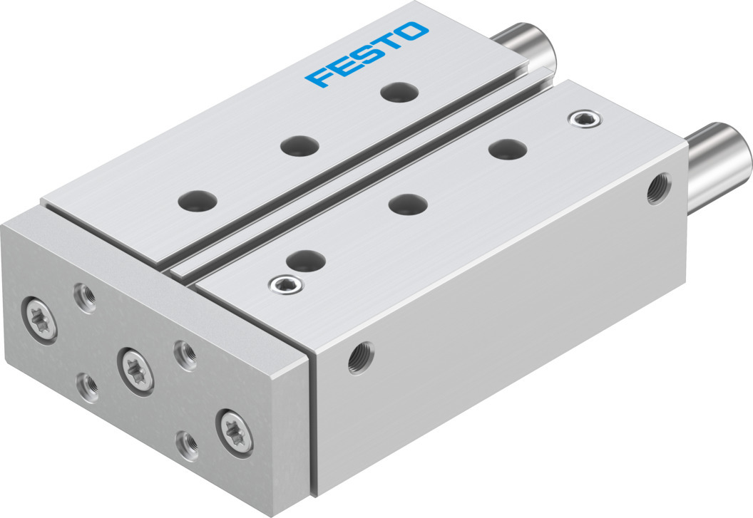 Führungszylinder DFM-32-100-P-A-GF mit integrierter Führung. Schwerpunktsabstand der Nutzlast zur Jochplatte=50 mm, Hub=100 mm, Kolben-Durchmesser=32 mm, Betriebsart Antriebseinheit=Joch, Dämpfung=P: elastische Dämpfungsringe/-platten beidseitig