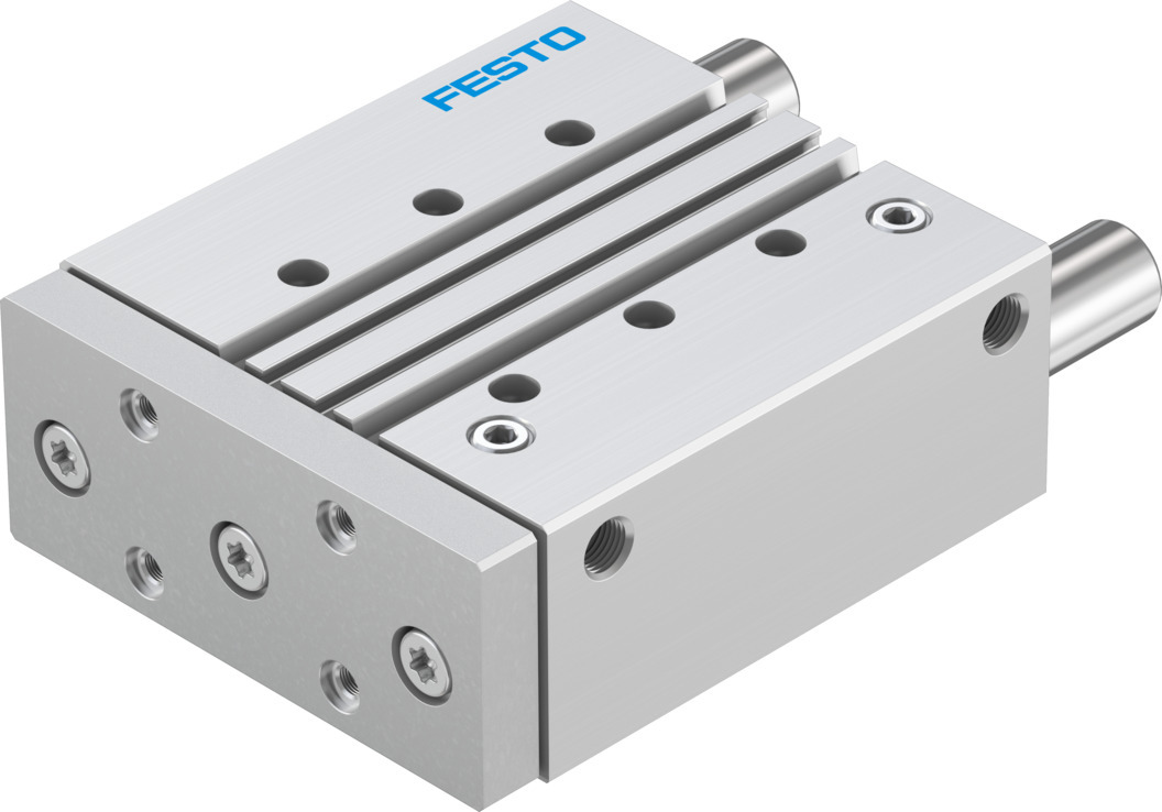Führungszylinder DFM-50-100-P-A-GF mit integrierter Führung. Schwerpunktsabstand der Nutzlast zur Jochplatte=50 mm, Hub=100 mm, Kolben-Durchmesser=50 mm, Betriebsart Antriebseinheit=Joch, Dämpfung=P: elastische Dämpfungsringe/-platten beidseitig