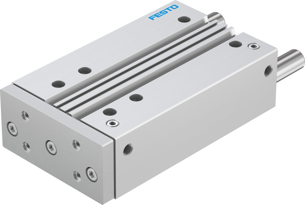 Führungszylinder DFM-63-200-P-A-GF mit integrierter Führung. Schwerpunktsabstand der Nutzlast zur Jochplatte=50 mm, Hub=200 mm, Kolben-Durchmesser=63 mm, Betriebsart Antriebseinheit=Joch, Dämpfung=P: elastische Dämpfungsringe/-platten beidseitig
