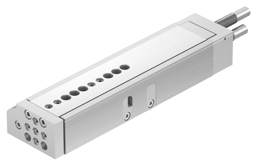 Mini-Schlitten DGSL-12-100-Y3A für Positionserkennung, mit hochpräziser hochbelastbarer Kugel-Käfig-Führung und einer sehr hohen Wiederholgenauigkeit, beidseitig hydraulische Stoßdämpfer (Y3). Hub=100 mm, Justierbarer Endlagenbereich / Länge vorne=68 mm, Justierbarer Endlagenbereich / Länge hinten=25,5 mm, Kolben-Durchmesser=16 mm, Betriebsart Antriebseinheit=Joch
