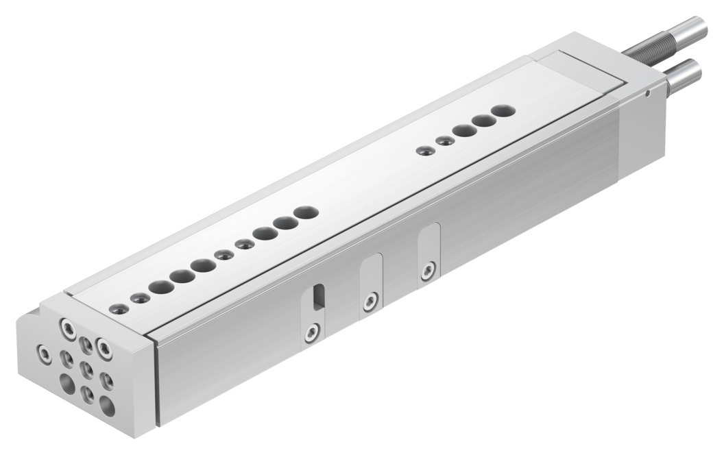 Mini-Schlitten DGSL-12-150-Y3A für Positionserkennung, mit hochpräziser hochbelastbarer Kugel-Käfig-Führung und einer sehr hohen Wiederholgenauigkeit, beidseitig hydraulische Stoßdämpfer (Y3). Hub=150 mm, Justierbarer Endlagenbereich / Länge vorne=87 mm, Justierbarer Endlagenbereich / Länge hinten=25,5 mm, Kolben-Durchmesser=16 mm, Betriebsart Antriebseinheit=Joch