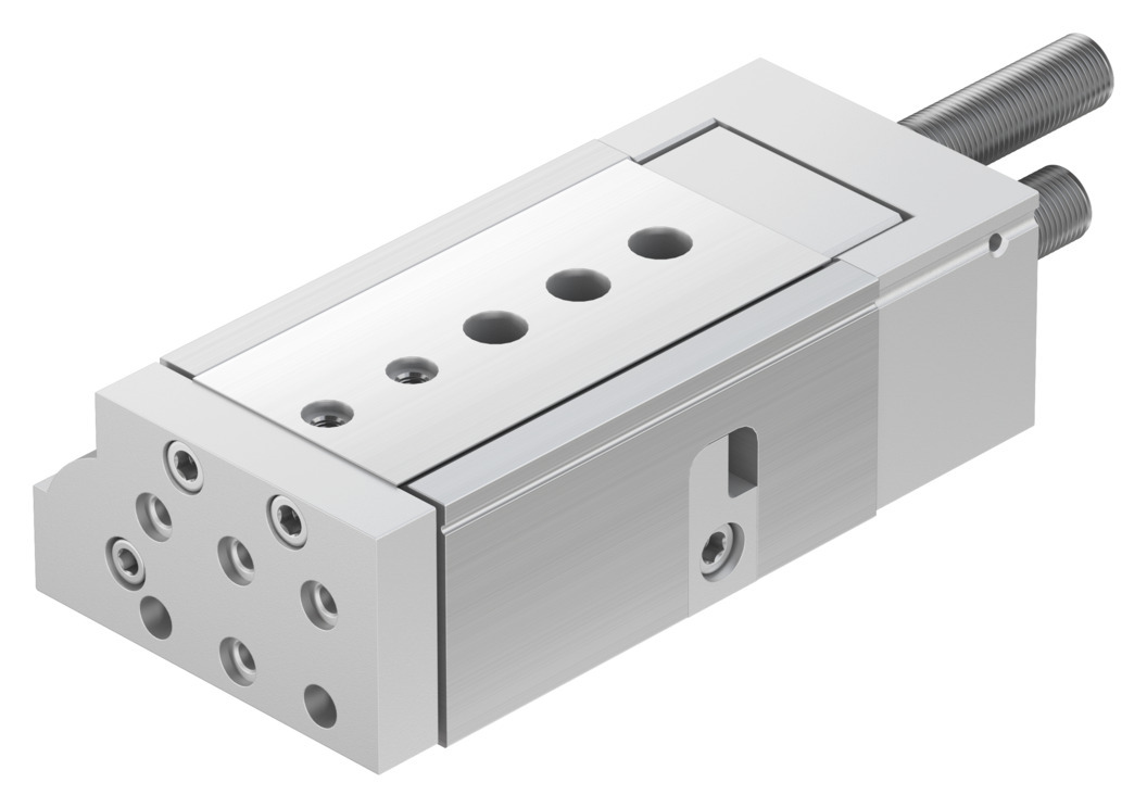 Mini-Schlitten DGSL-20-30-PA für Positionserkennung, mit hochpräziser hochbelastbarer Kugel-Käfig-Führung, beidseitig elastische Dämpfung ohne metallische Endlage (P). Hub=30 mm, Justierbarer Endlagenbereich / Länge vorne=50,5 mm, Justierbarer Endlagenbereich / Länge hinten=49,5 mm, Kolben-Durchmesser=25 mm, Betriebsart Antriebseinheit=Joch