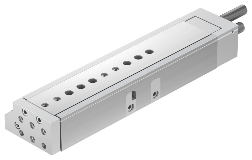 Mini-Schlitten DGSL-25-150-PA für Positionserkennung, mit hochpräziser hochbelastbarer Kugel-Käfig-Führung, beidseitig elastische Dämpfung ohne metallische Endlage (P). Hub=150 mm, Justierbarer Endlagenbereich / Länge vorne=110 mm, Justierbarer Endlagenbereich / Länge hinten=49 mm, Kolben-Durchmesser=32 mm, Betriebsart Antriebseinheit=Joch