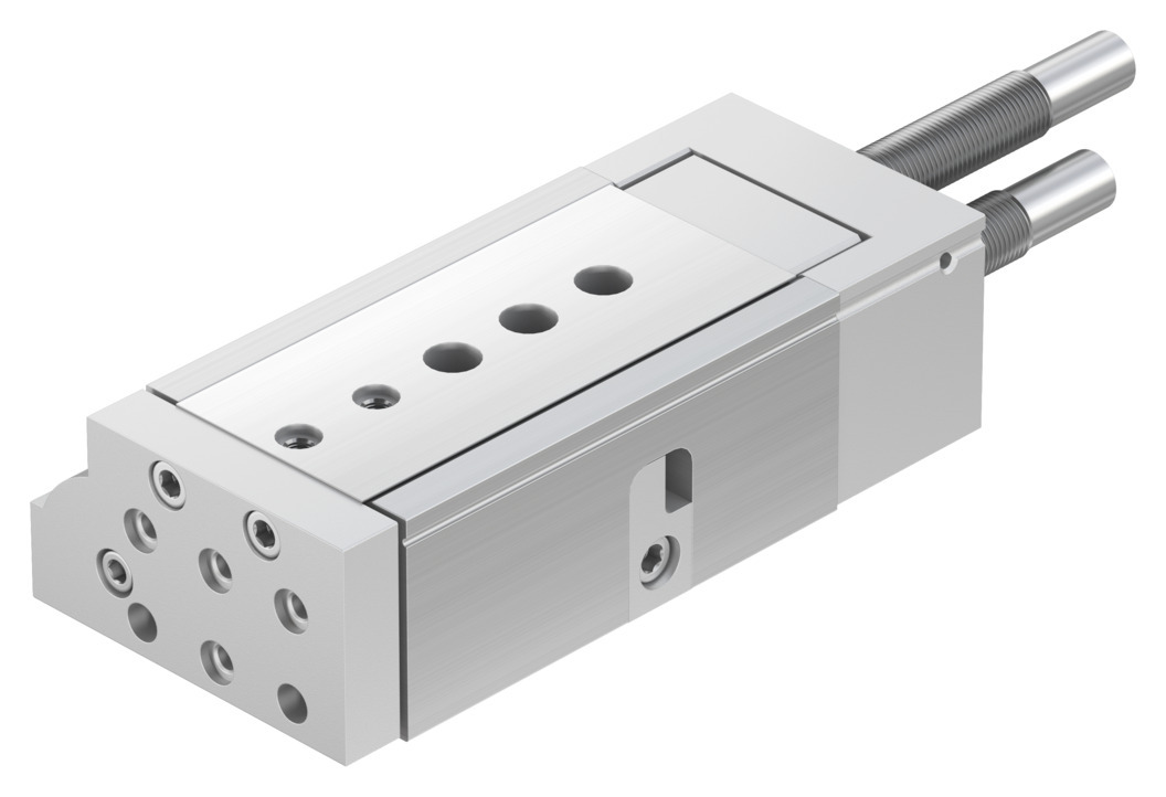 Mini-Schlitten DGSL-25-40-Y3A für Positionserkennung, mit hochpräziser hochbelastbarer Kugel-Käfig-Führung und einer sehr hohen Wiederholgenauigkeit, beidseitig hydraulische Stoßdämpfer (Y3). Hub=40 mm, Justierbarer Endlagenbereich / Länge vorne=56 mm, Justierbarer Endlagenbereich / Länge hinten=51,5 mm, Kolben-Durchmesser=32 mm, Betriebsart Antriebseinheit=Joch