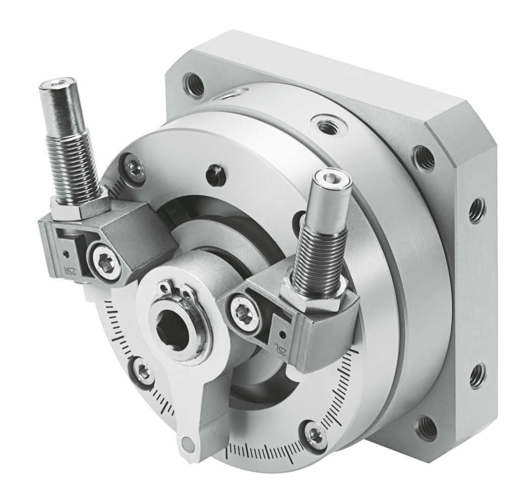 Schwenkantrieb DSM-32-270-CC-A-B mit Zapfenwelle, Stoßdämpfer beidseitig, Positionserkennung. Baugröße=32, Dämpfungswinkel=12 deg, Einstellbereich Schwenkwinkel=0 - 246 deg, Schwenkwinkel=0 - 246 deg, Dämpfung=CC: Stoßdämpfer beidseitig