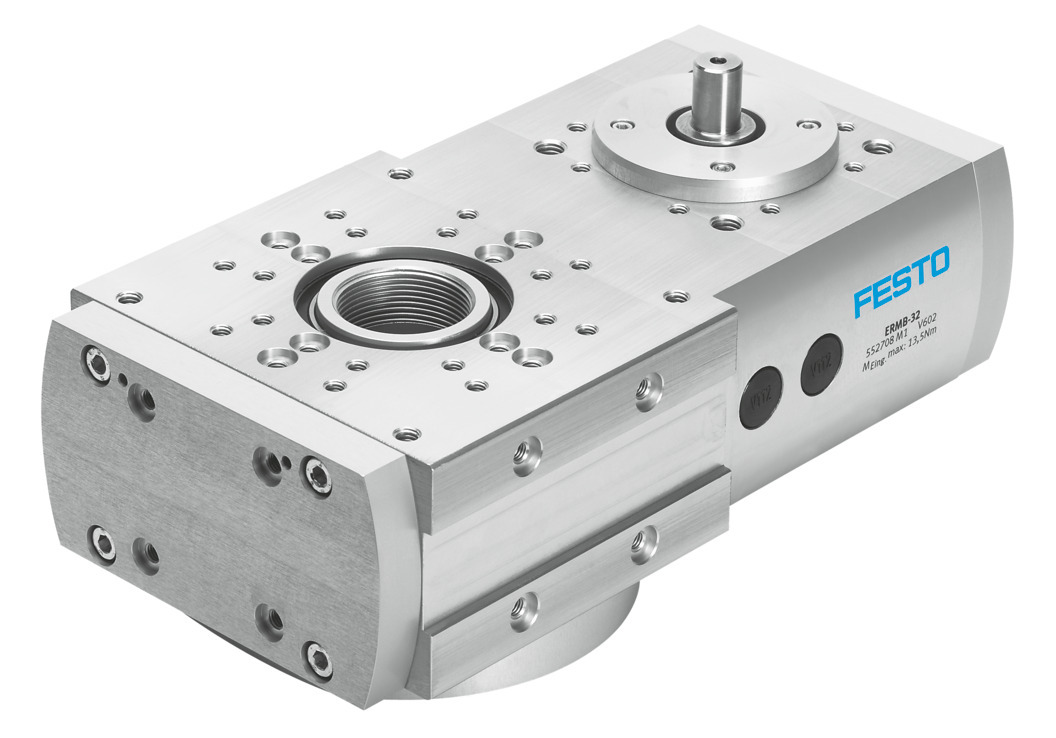 Drehmodul ERMB-32 elektrisch. Die Abtriebsschnittstelle ist identisch, wie beim pneumatischen Schwenkantrieb DRQD. Baugröße=32, Konstruktiver Aufbau=(* Elektromechanisches Drehmodul, * mit Zahnriemen), Einbaulage=beliebig, Drehwinkel=endlos, Getriebeübersetzung=3:1