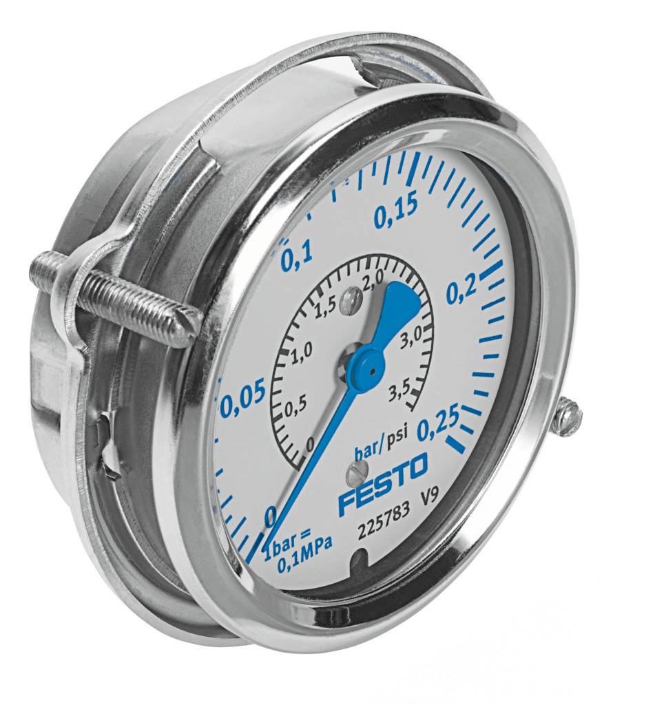 Flanschmanometer FMA-63-0,25-C Flanschmanometer FMA-63-0,25-C Fronttafeleinbau; Nenngröße 63; 0 ... 0,25 bar/0 ... 3,6 psi; Außengewinde G1/4; Messing; Rückseite zentrisch; Doppelskala (bar außen, psi innen); Messgenauigkeit Klasse 1,6