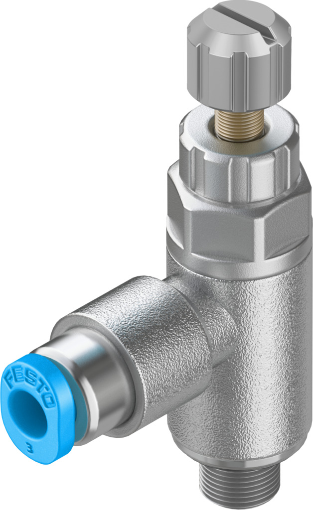 Drossel-Rückschlagventil GRLA-M5-QS-3-RS-D Drossel-Rückschlagventil GRLA-M5-QS-3-RS-D Metallausführung; L-Form; Abluft-Drossel-Rückschlagfunktion; Einstellelement Rändelschraube; Außengewinde M5; Für Schlauch Außen-Ø 3 mm