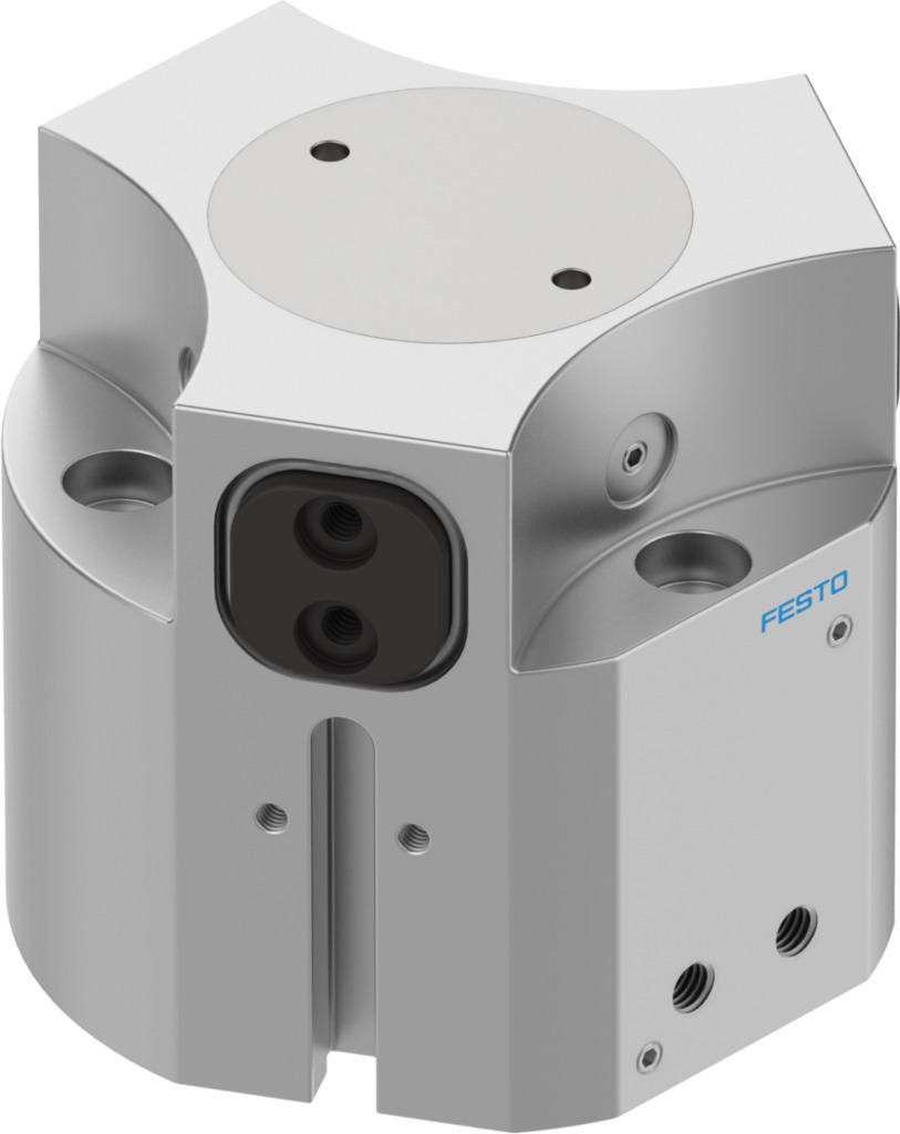 Dreipunktgreifer HGDD-40-A-G2 mit Greifkraftsicherung schließend ...-G2. Baugröße=40, Hub pro Greifbacken=6 mm, Max. Austauschgenauigkeit=<= 0,2 mm, Max. Greifbackenwinkelspiel ax,ay=<= 0,1 deg, Max. Greifbackenspiel Sz=<= 0,05 mm