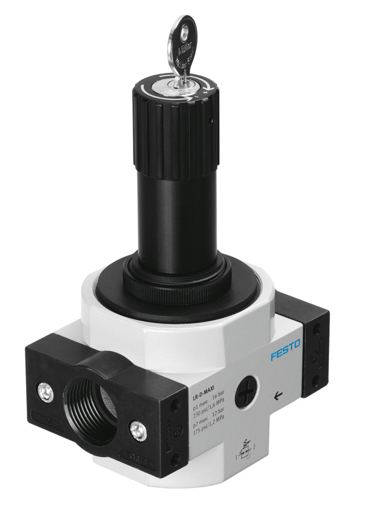 Druckregelventil LRS-1/2-D-O-MIDI mit abschließbarem Reglerkopf, Arbeitsdruck bis 12 bar. Baugröße=Midi, Baureihe=D, Betätigungssicherung=Drehknopf mit integriertem Schloss, Einbaulage=beliebig, Konstruktiver Aufbau=direktgesteuertes Membranregelventil