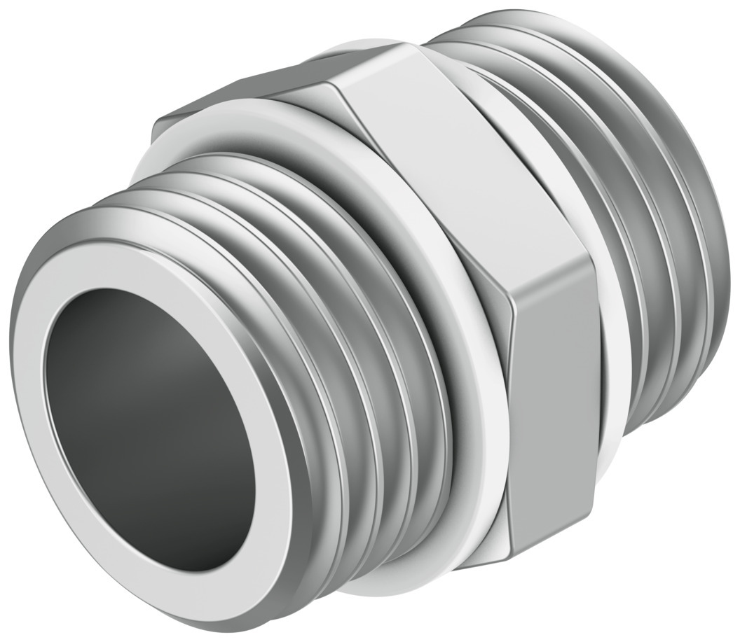 Doppelnippel NPFC-DS-G38-G38-M Werkstoff Gewindeverschraubung=Messing, vernickelt, Gebindegröße=10, Betriebsdruck=-0,95 - 10 bar, Betriebsmedium=Druckluft nach ISO8573-1:2010 [-:-:-], Korrosionsbeständigkeitsklasse KBK=1 - niedrige Korrosionsbeanspruchung