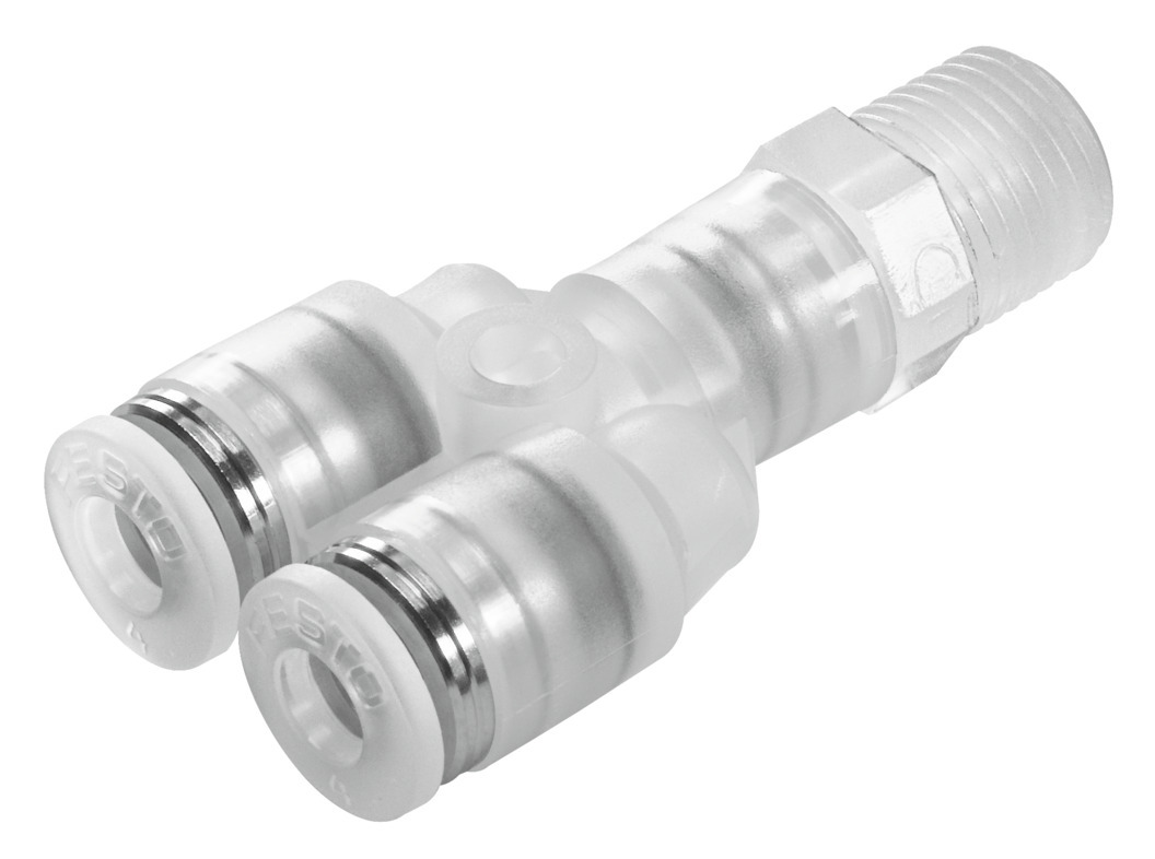 Y-Steckverschraubung NPQP-Y-R38-Q12-FD-P10 Y-Steckverschraubung NPQP-Y-R38-Q12-FD-P10 Medienresistent; Y-Form; Mit Außensechskant; Außengewinde R3/8; Für Schlauch Außen-Ø 12 mm; Packungsmenge 10 Stück; Lebensmitteltauglichkeit
