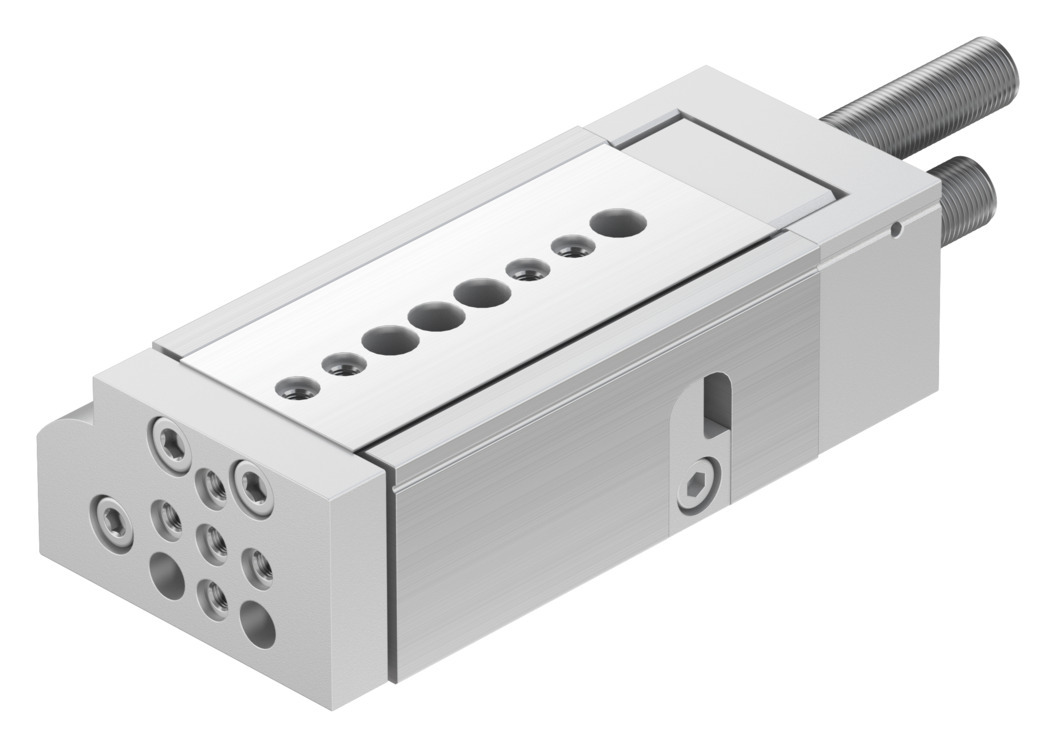 Mini-Schlitten DGSL-16-20-PA für Positionserkennung, mit hochpräziser hochbelastbarer Kugel-Käfig-Führung, beidseitig elastische Dämpfung ohne metallische Endlage (P). Hub=20 mm, Justierbarer Endlagenbereich / Länge vorne=37,5 mm, Justierbarer Endlagenbereich / Länge hinten=39,5 mm, Kolben-Durchmesser=20 mm, Betriebsart Antriebseinheit=Joch