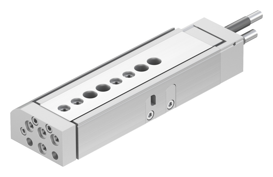 Mini-Schlitten DGSL-8-50-Y3A für Positionserkennung, mit hochpräziser hochbelastbarer Kugel-Käfig-Führung und einer sehr hohen Wiederholgenauigkeit, beidseitig hydraulische Stoßdämpfer (Y3). Hub=50 mm, Justierbarer Endlagenbereich / Länge vorne=31 mm, Justierbarer Endlagenbereich / Länge hinten=14 mm, Kolben-Durchmesser=10 mm, Betriebsart Antriebseinheit=Joch