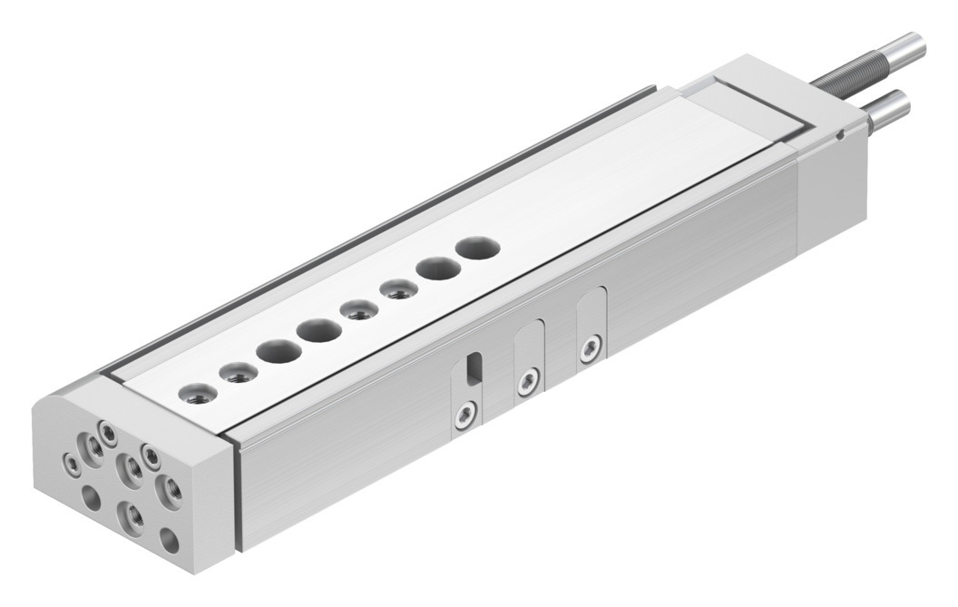 Mini-Schlitten DGSL-8-80-Y3A für Positionserkennung, mit hochpräziser hochbelastbarer Kugel-Käfig-Führung und einer sehr hohen Wiederholgenauigkeit, beidseitig hydraulische Stoßdämpfer (Y3). Hub=80 mm, Justierbarer Endlagenbereich / Länge vorne=47 mm, Justierbarer Endlagenbereich / Länge hinten=14 mm, Kolben-Durchmesser=10 mm, Betriebsart Antriebseinheit=Joch