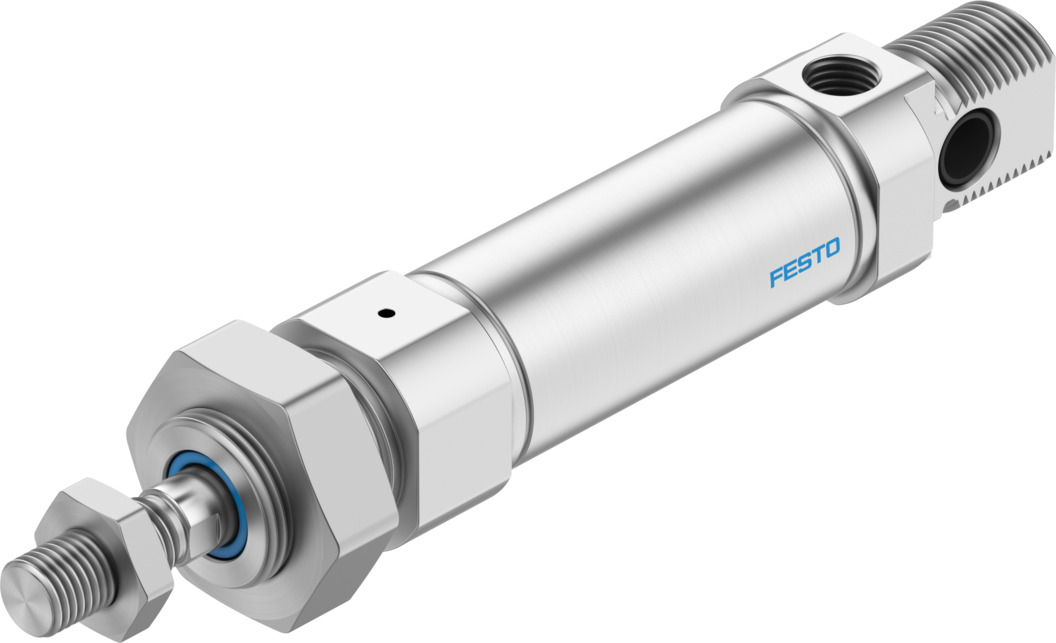 Normzylinder ESNU-25-25-P-A nach DIN ISO 6432 für Positionserkennung. Verschiedene Befestigungsmöglichkeiten, mit und ohne zusätzliche Befestigungselemente. Mit elastischen Dämpfungsringen in den Endlagen. Hub=25 mm, Kolben-Durchmesser=25 mm, Kolbenstangengewinde=M10x1,25, Dämpfung=P: elastische Dämpfungsringe/-platten beidseitig, Einbaulage=beliebig