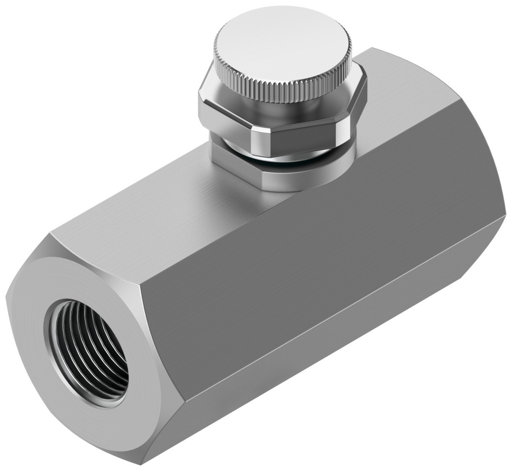 Drosselventil GRO-1/4 Ventilfunktion=Drossel-Funktion, Pneumatischer Anschluss 1=G1/4, Pneumatischer Anschluss 2=G1/4, Einstellelement=Rändelschraube, Befestigungsart=Leitungseinbau