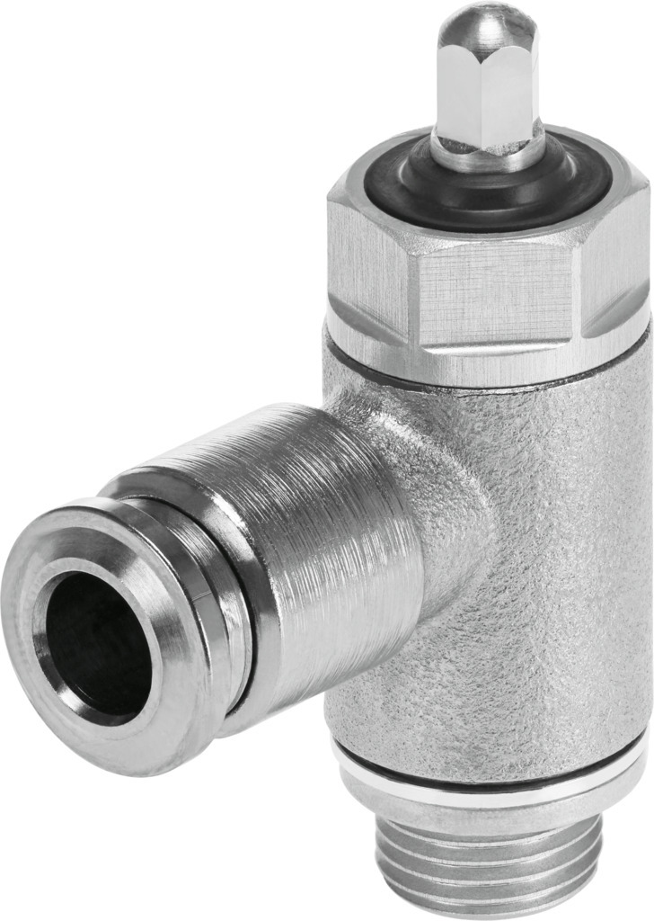 Drossel-Rückschlagventil VFOH-LE-A-G18-Q4 Drossel-Rückschlagventil VFOH-LE-A-G18-Q4 L-Form; Abluft-Drossel-Rückschlagfunktion; Einstellelement Außensechskant; Außengewinde G1/8; Für Schlauch Außen-Ø 4 mm