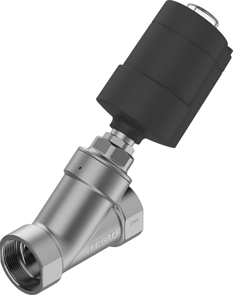 Schrägsitzventil VZXA-A-TS7-2"-M6-B1T-8-K-75-20-PR-PM Konstruktiver Aufbau=Sitzventil mit Kolbenantrieb, Betätigungsart=pneumatisch, Einbaulage=beliebig, Befestigungsart=Leitungseinbau, Leitungsanschluss=Gewindemuffe 2 NPT nach ANSI/ASME B 1.20.1